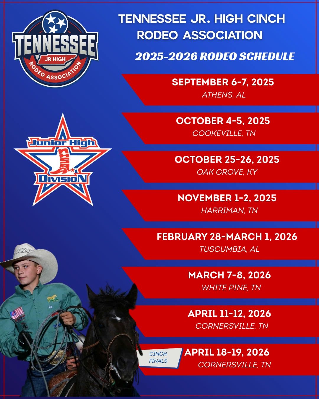 Tennessee Jr High School Rodeo Association features top cowboys and cowgirls in grades 5th thru 8th grade competing in a variety of events including bull riding, barrel racing, and team roping. The Top 4 in each event represent Tennessee at the National Junior High School Finals Rodeo.